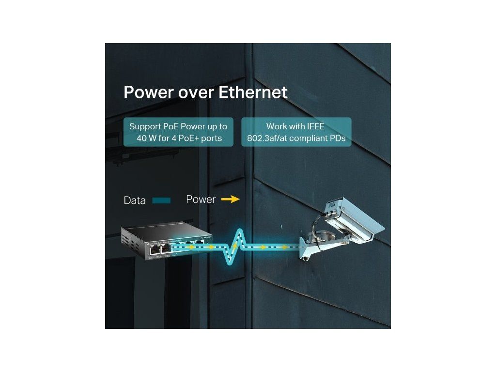 Switch TL-SG1005LP je vybaven 5 porty s rychlostmi přenosu dat 10/100/1000 MB/s, kdy 4 z nich nabízí napájení pomocí PoE. Dokáže tak automaticky detekovat a napájet jakákoliv zařízení PD (Powered Devices), která splňují protokol IEEE 802.3af. V tomto provedení je elektrické napájení přenášeno společně s daty přes stejný kabel, což vám umožňuje rozšířit vaši síť i do míst, kde nejsou elektrické přípojky nebo zásuvky.