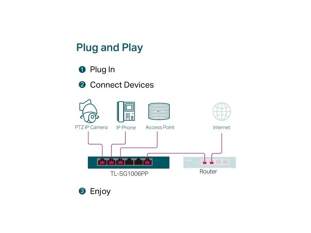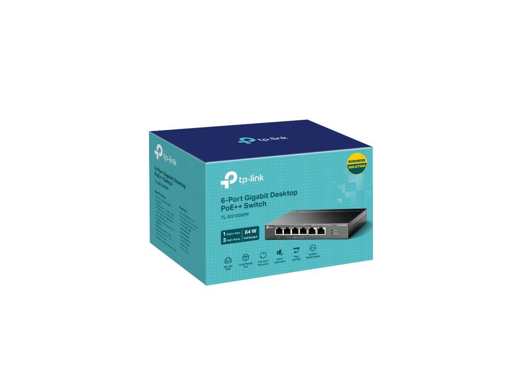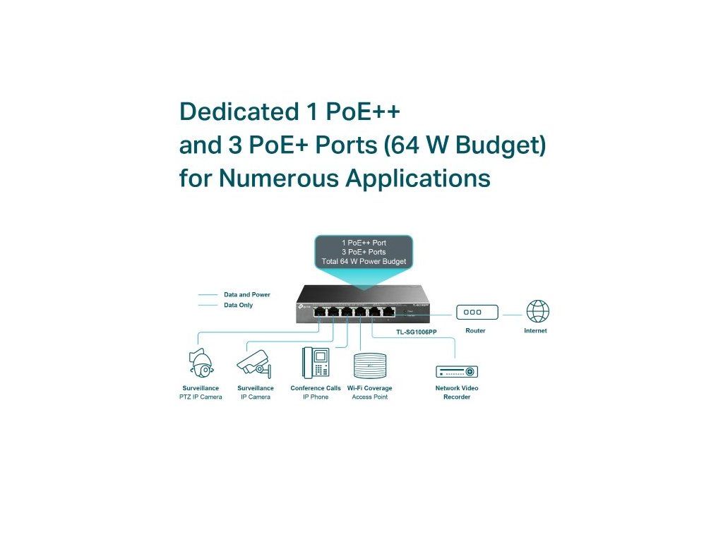 Switch TP-Link TL-SG1006PP je vybavený celkem šesti 10/100/1000Mbps RJ45 porty. Z toho má 1 PoE++ port a 3 PoE+ porty. Switch spolupracuje se standardem IEEE 802.3af/at/bt (kompatibilní s PD). Pomocí kabelu současně přenášíte data a napájíte zařízení. Port 1 (standard 802.3af/at/bt PoE++) poskytuje výkon až 60 W. Porty 2–4 (standard 802.3af/at PoE+) mají výkon až 30 W na každém PoE+ portu. Celkový výkon na napájení PoE dosahuje hodnoty 64 W. K přepínači připojíte IP kamery, přístupové body, IP telefony, počítače, tiskárny a další podobná kompatibilní zařízení.