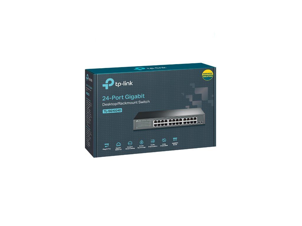 TP-LINK TL-SG1024D je vysoce kvalitní 24x portový přepínač určený k instalaci do 13" skříně typu rack. Tento model podporuje takřka veškeré ethernetové protokoly IEEE 802.3, poskytuje šířku pásma o velikosti 48 Gb/s a tabulku MAC adres s možností uložení až 8000 záznamů. Switch je vybavený úsporným systém, který nabízí celkovou úsporu elektrické energie až o 40 % a každý port je opatřen LED diodami, které indikují jeho aktivitu a rychlost a technologií, která ho odpojí od zdroje energie v případě, že není nutné jeho napájení.Plech na předělání do 19" rozvaděče je součástí balení.