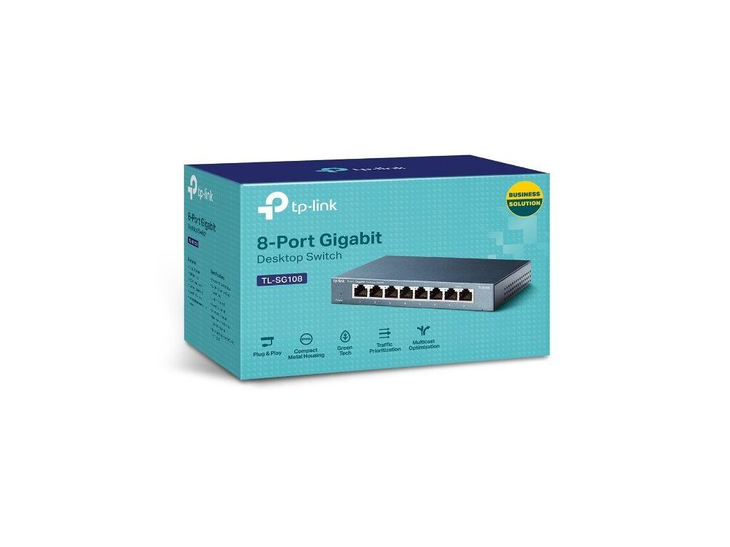 TP-Link TL-SG108 je vysokorychlostní gigabitový stolní switch v kovovém těle, který je ideálním řešením pro pracovní skupiny. Obsahuje 8x 10/100/1000BASE-T gigabitový Ethernet port s AUTO-MDIX s maximální rychlost 2000 Mbps ve full duplex modu a LED indikátory zobrazují instalaci kabelů a diagnostiku.Parametry: