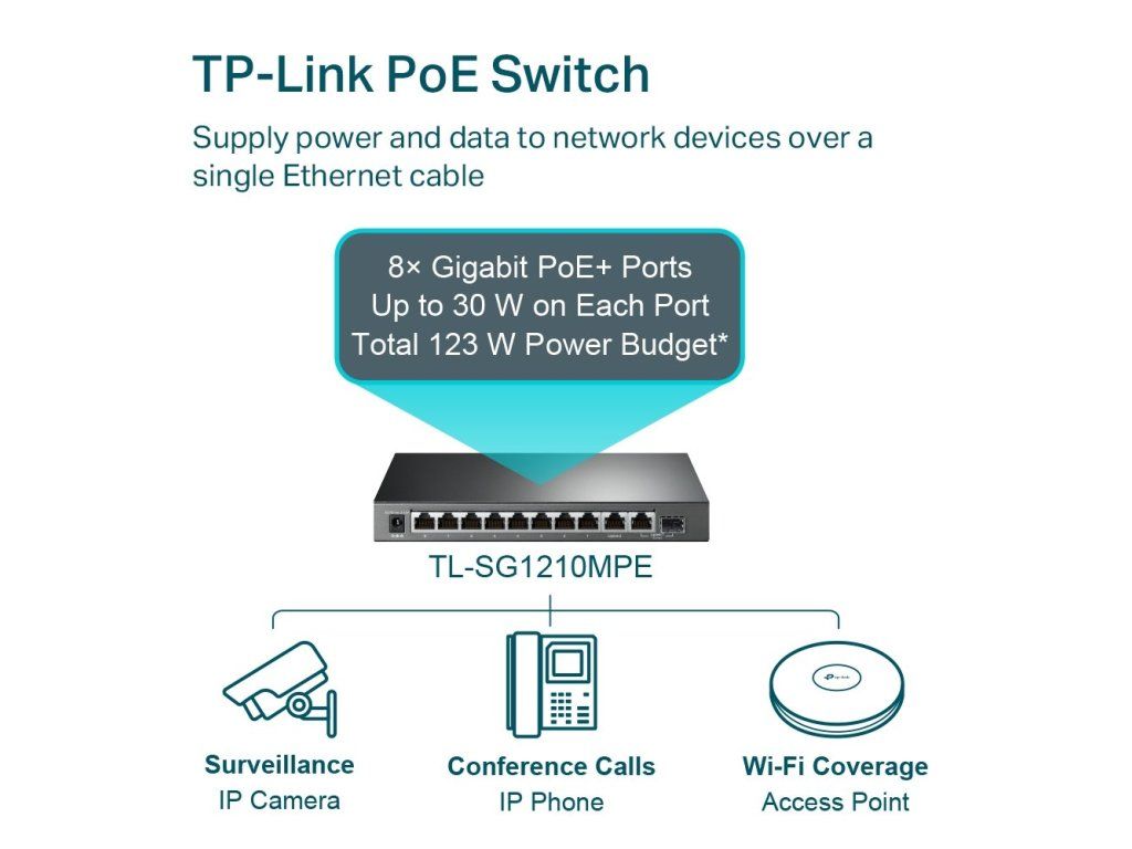 Výkonný PoE přepínač TP-LINK TL-SG1210MPE nabízí 8 GLAN/PoE portů, 1 klasický RJ-45 konektor pro LAN a 1 SFP/RJ-45 Combo port pro uplink. Tento desktopový switch dokáže přenášet napájení i data jediným kabelem přímo k danému koncovému zařízení. Přepínač je pak vhodný pro PC, notebooky, tiskárny, NAS úložiště, Wi-Fi AP, IP kamery, IP telefony, IP systémy do autobusů nebo různé senzory pro automatizaci budov a správu vozového parku. Jedná se tak o skvělý doplněk pro rozšíření počítačové sítě v malých i středních firmách či kdekoliv jinde, kde je zapotřebí propojit jednotlivé síťové prvky do hvězdicové topologie.