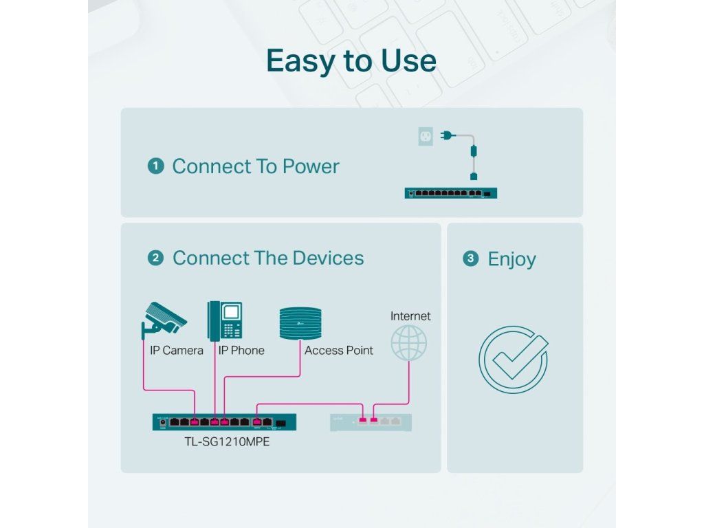 - Plug-and-Play switch TL-SG1210MPE nabízí provoz bez nutnosti konfigurace a pomocných nástrojů