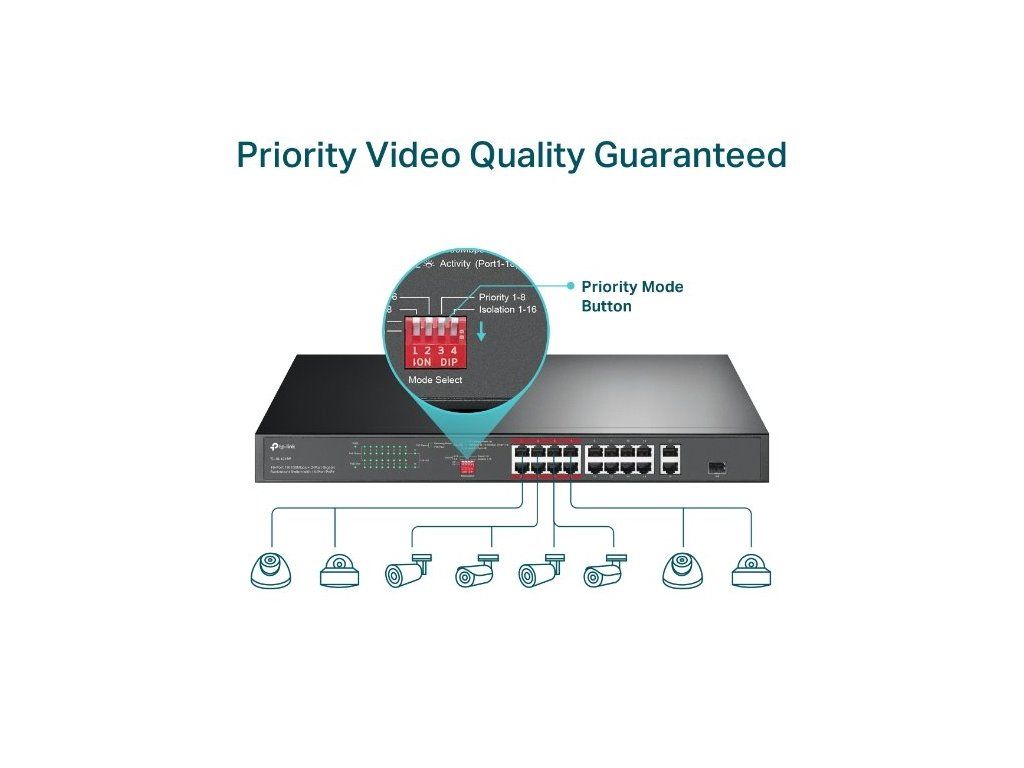 - Prioritní režim pro porty 1-8, který zaručuje kvalitu citlivých aplikací, jako je například video monitor.