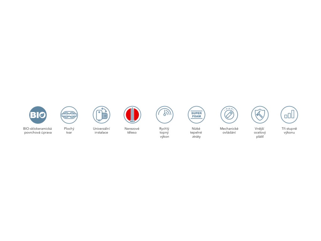 Díky své konstrukci zabírá velmi málo místa a je tak vhodný i do malých koupelen nebo tam, kde není dostatek místa pro klasický válcový ohřívač. Díky svému designu nenaruší vzhled místnosti, ve které bude instalován a stane se tak její příjemnou součástí. Ohřívač má manuální knoflík, který je jednoduše ovladatelný pro nastavení teploty vody. Lze si také zvolit výkon 1000 / 1500 / 2500 W. K ohřívači není nutné samostatně dokupovat zavěšovací a montážní příslušenství, vše je již obsaženo v jeho balení včetně pojistného ventilu. Ohřívač je možné namontovat také horizontálně, s přívody vody z levé strany a z výroby je vybaven kabelem do zásuvky 230V.