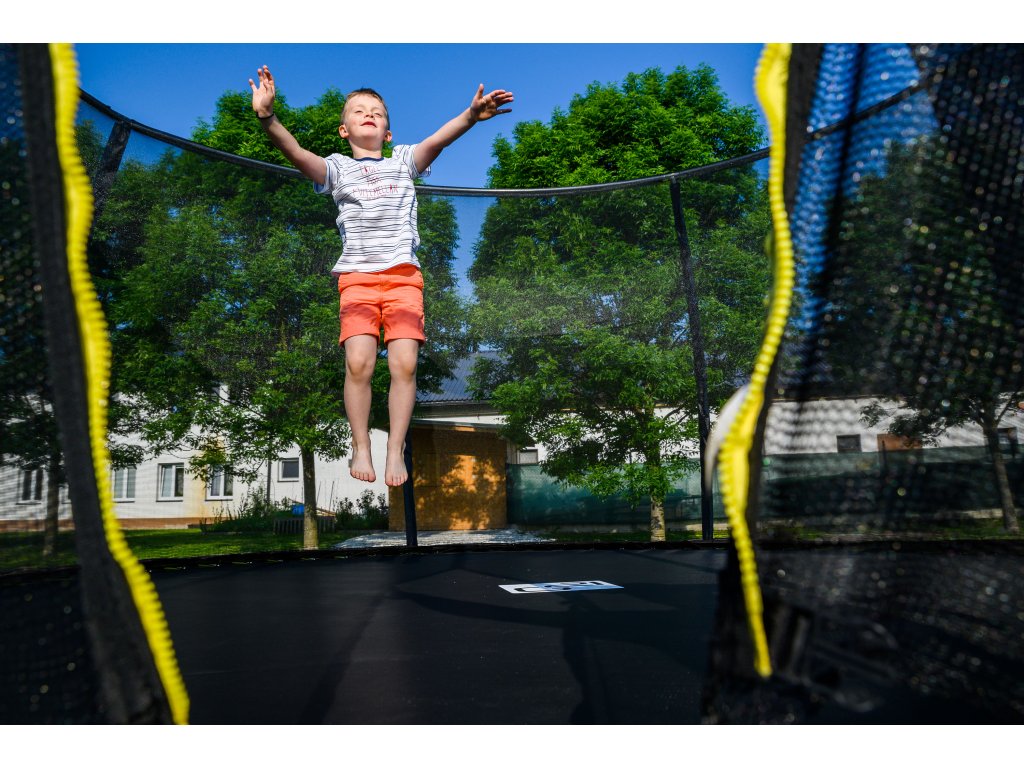 - Ochranná síť trampolíny je z vnitřní strany konstrukce, skákání na trampolíně je tak bezpečnější