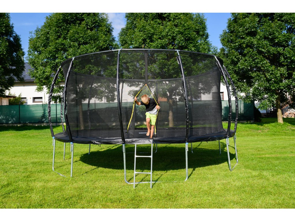 - Ochranná síť trampolíny je z vnitřní strany konstrukce, skákání na trampolíně je tak bezpečnější