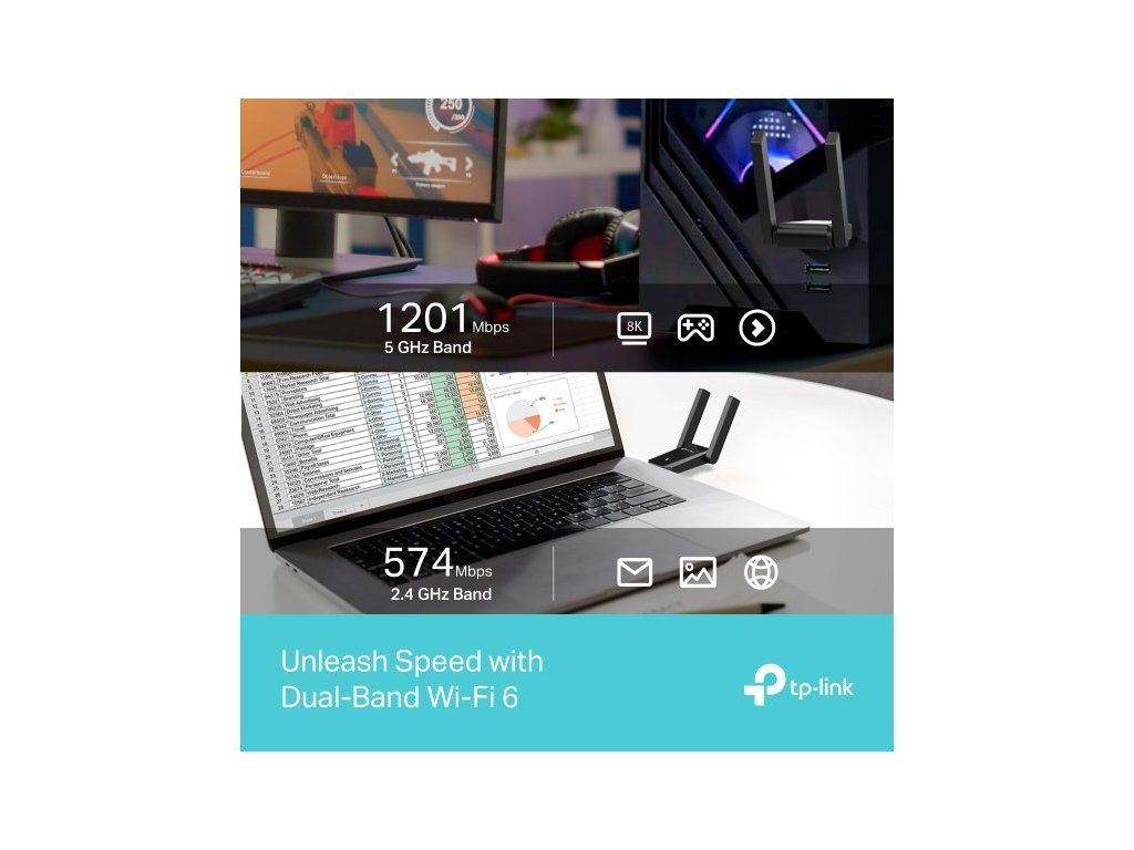 Adaptér Archer TX30U Plus nabízí rychlost až 1201 Mbit/s ve frekvenci 5 GHz a 574 Mbit/s v pásmu 2,4 GHz, takže zvládnete streamování, videohovory i online hraní bez zpoždění. Dvě externí nastavitelné antény s vysokým ziskem ve spojení s technologií Beamforming zajišťují silný signál i ve větších prostorách. Připojení přes USB 3.0 zaručuje minimální latenci a maximální efektivitu.