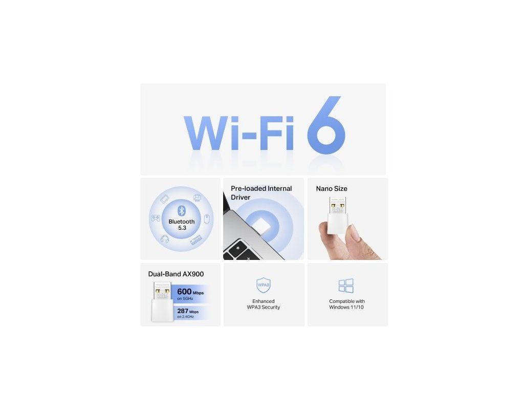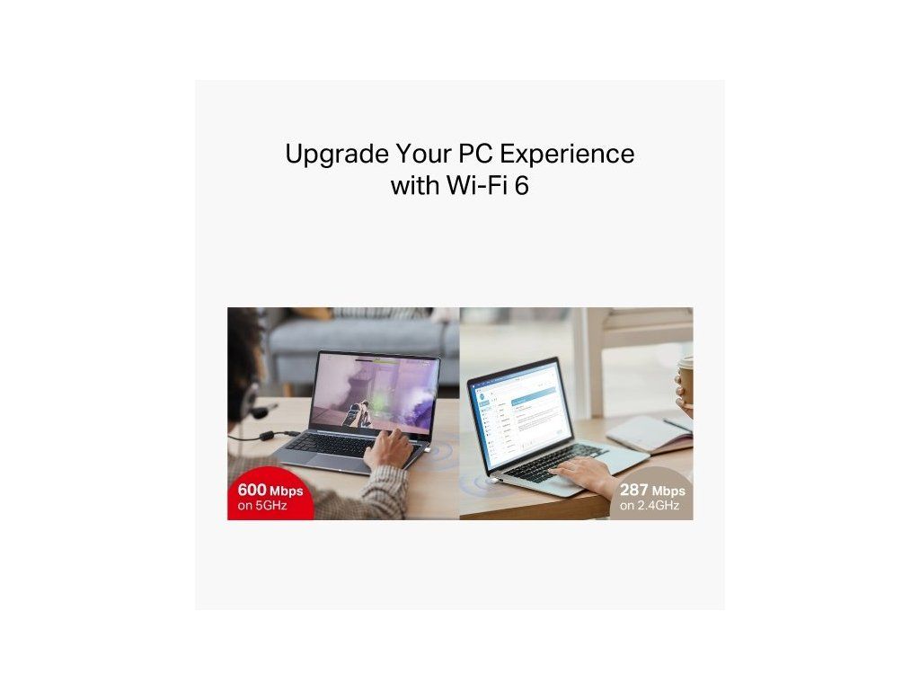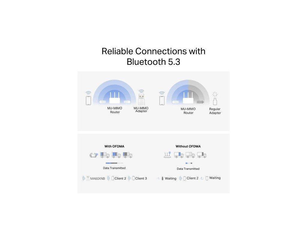 Adaptér MA60XNB využívá nejnovější standard Wi-Fi 6, který zajišťuje rychlé a efektivní připojení. Zvládá až 600 Mb/s na 5 GHz pro streamování a hraní her a 287 Mb/s na 2,4 GHz pro běžné online aktivity. Technologie OFDMA a MU-MIMO umožňují přenášet data více zařízením současně, bez zpoždění.