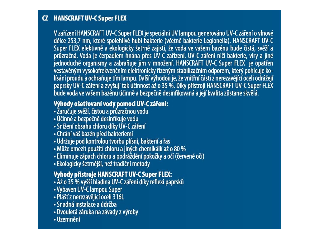 V zařízení HANSCRAFT UV-C Super FLEX je speciální UV lampou generováno UV-C záření o vlnové délce 253,7 nm, které spolehlivě hubí bakterie (včetně bakterie Legionella). HANSCRAFT UV-C Super FLEX efektivně a ekologicky šetrně zajistí, že voda ve vašem bazénu bude čistá, svěží a průzračná.