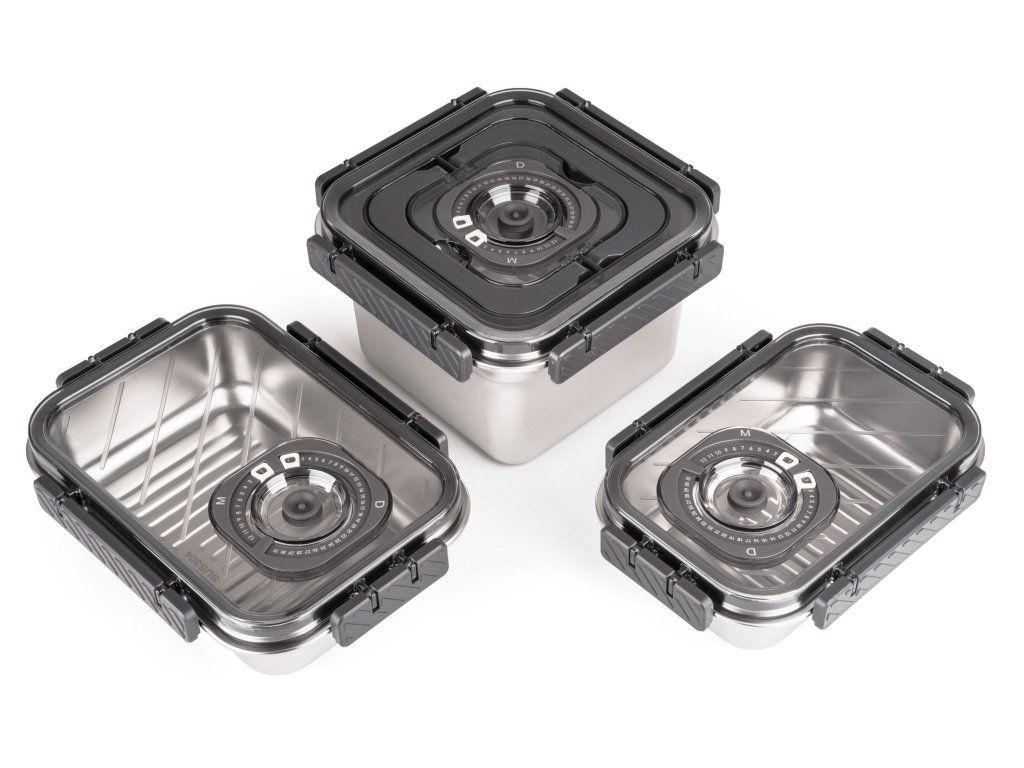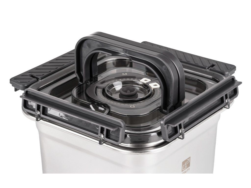 Víko z BPA Free plastu je vybavené vakuovacím ventilem a praktickým nastavitelným ukazatelem data. Budete tak vědět, kdy byly potraviny vakuovány nebo do kdy se mají spotřebovat. Pro uvolnění vakua a otevření dózy stačí jemně zmáčknout ventil uprostřed víka.