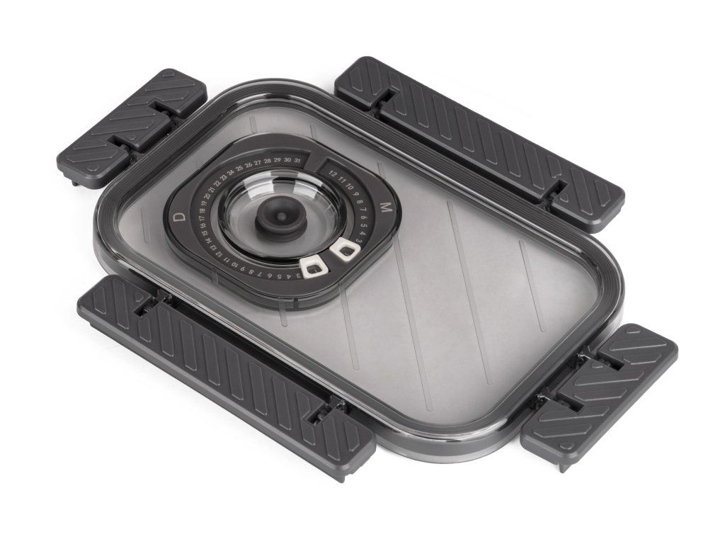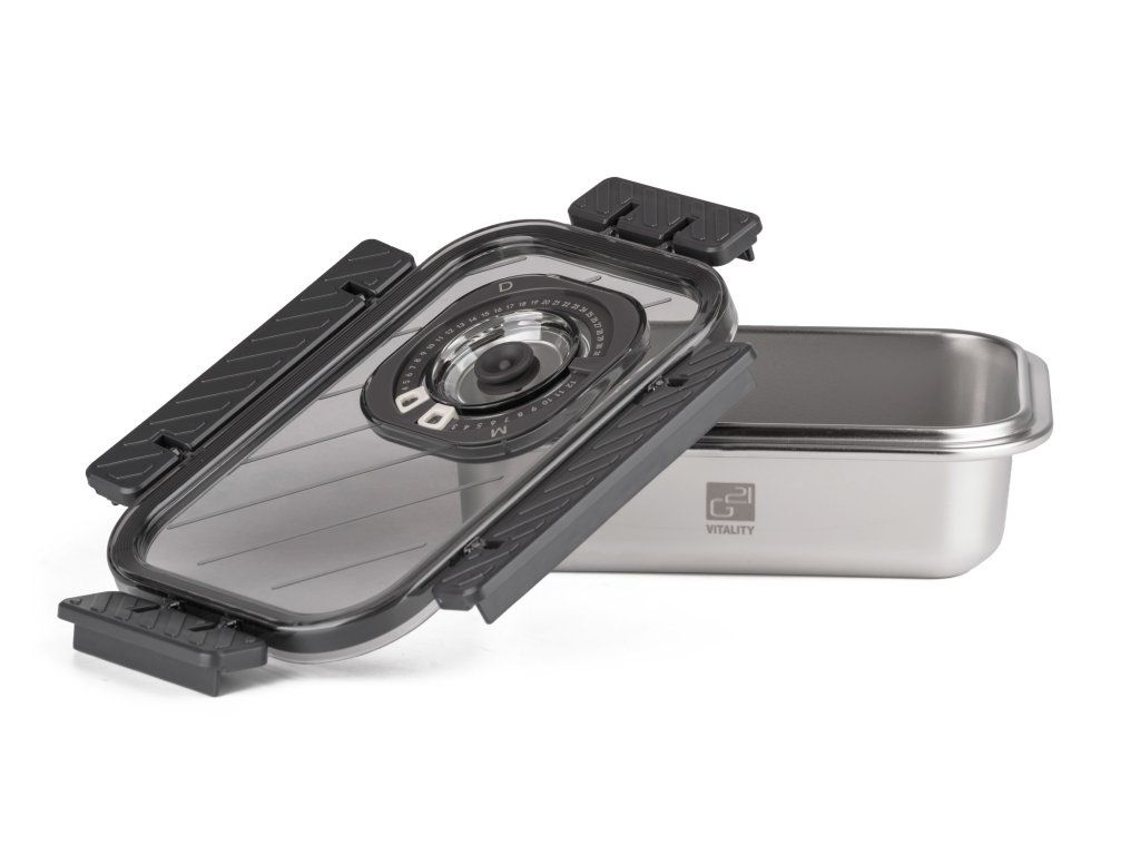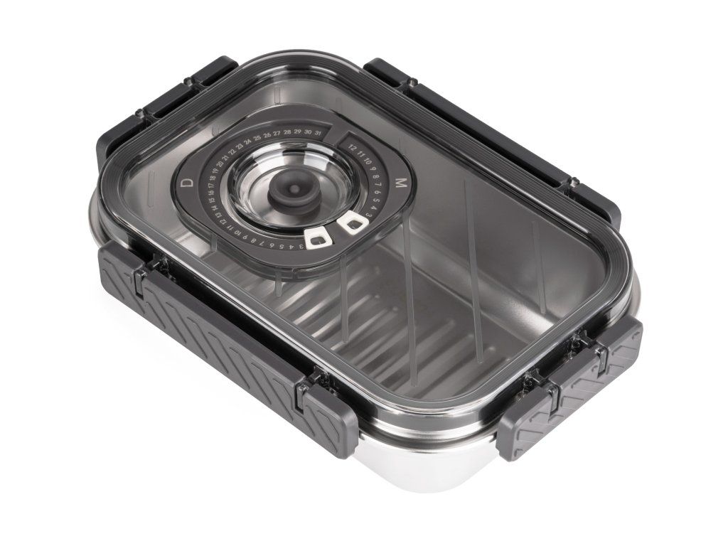 Víko z BPA Free plastu je vybavené vakuovacím ventilem a praktickým nastavitelným ukazatelem data. Budete tak vědět, kdy byly potraviny vakuovány nebo do kdy se mají spotřebovat. Pro uvolnění vakua a otevření dózy stačí jemně zmáčknout ventil uprostřed víka.