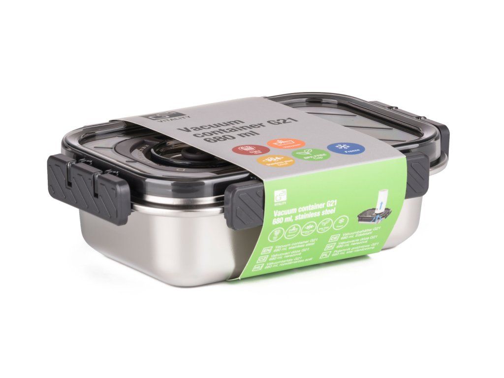 Bezpečné, odolné a hygienické skladování potravin. Nerezová vakuovací dóza G21 s objemem 680 ml je ideální pro prodloužení čerstvosti potravin i praktické uskladnění v ledničce, mrazáku nebo pečení bez víka. Využijete ji každý den a pro každou situaci – doma i na cestách.