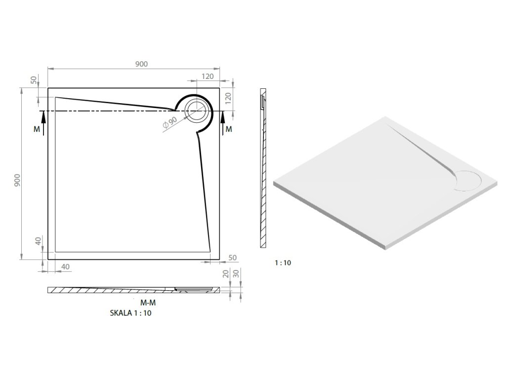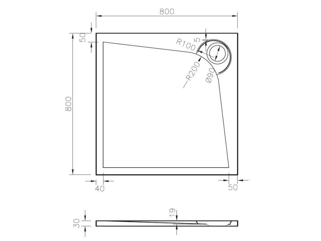 Tabulka rozměrů čtvercové vaničky Boomerang