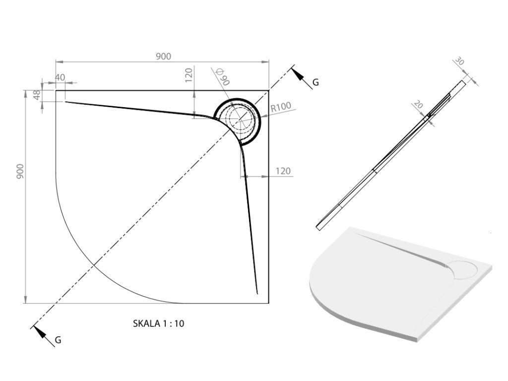 Specifikace čtvrtkruhové sprchové vaničky Boomerang