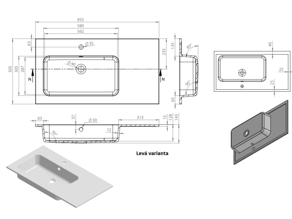 Vayer Tucana L/P 95 umyvadlo na desku, litý mramor Orientace: Pravá, TUCC_PRA