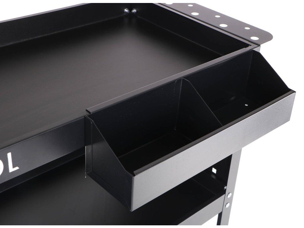 Vozík MECHANIC TROLLEY ROGER je navržen pro efektivní a přehledné uspořádání nářadí. Tři kovové police o rozměru 66 × 35 cm bezpečně udrží i těžší nástroje, díky zvýšeným okrajům nehrozí jejich sklouznutí. Odnímatelný plastový box na horní polici poslouží k uložení drobných součástek nebo spojovacího materiálu.