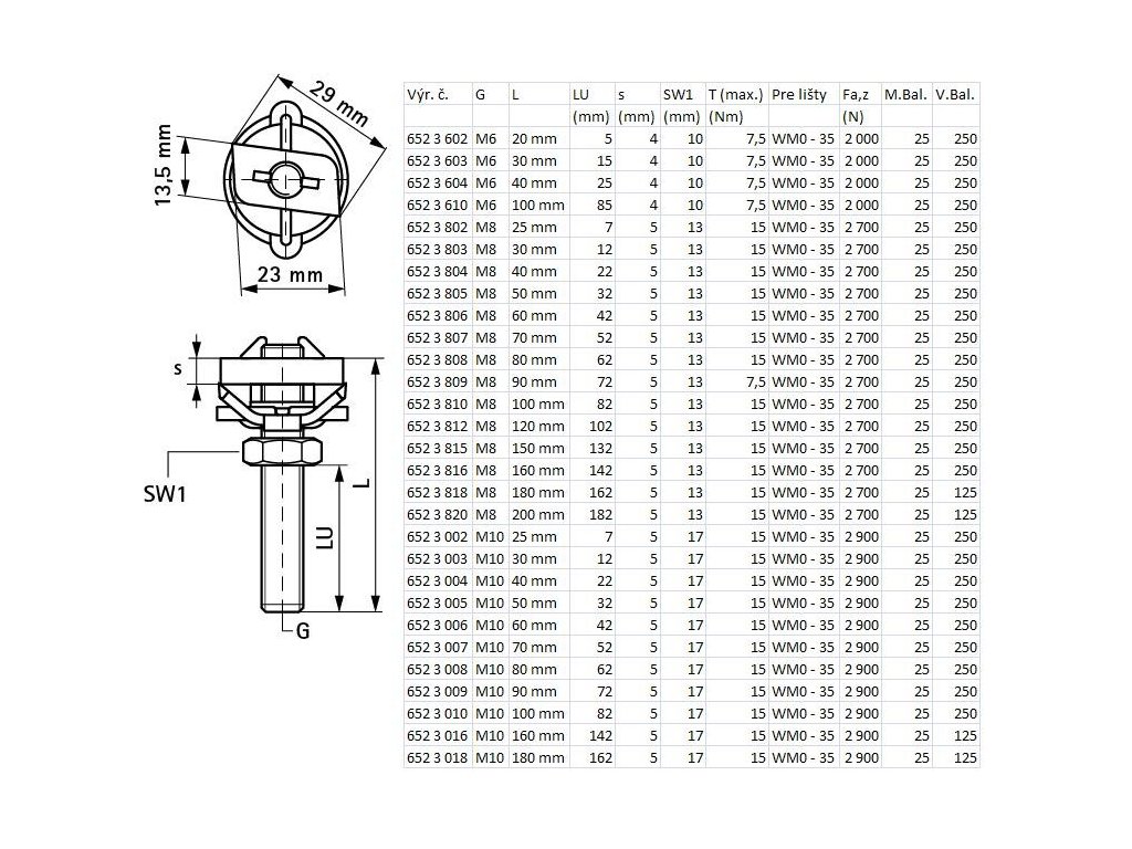 | 6523006 | M10 | 60 mm | 42 | 5,0 | 17 | 10,0 | 27x18, 30x15, 30x20, 30x30, 30x45, 38x40 | 2 900 | 290 | 25 | 250 | ks | 54.00 |