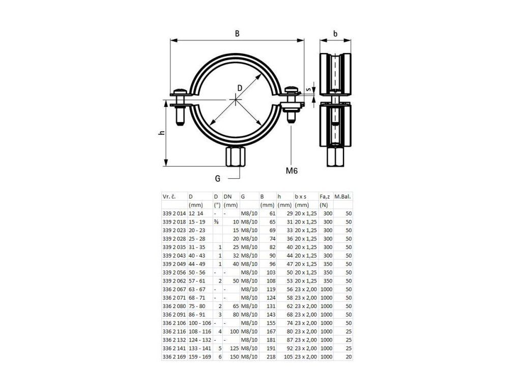 | Výr. č. | D (mm) | D (") | DN | G | B (mm) | H (mm) | h (mm) | b x s (mm) | cs | Fa,z (N) | RAL | M.Bal. | Sj. | Váha (g) |