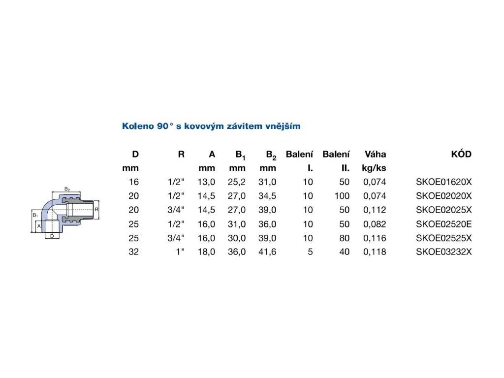 WAVIN EKOPLASTIK PPR koleno 20mm, 1/2", 90°, s kovovým závitem vnějším, svařovací, voda, PP-R, SKOE02020RCT