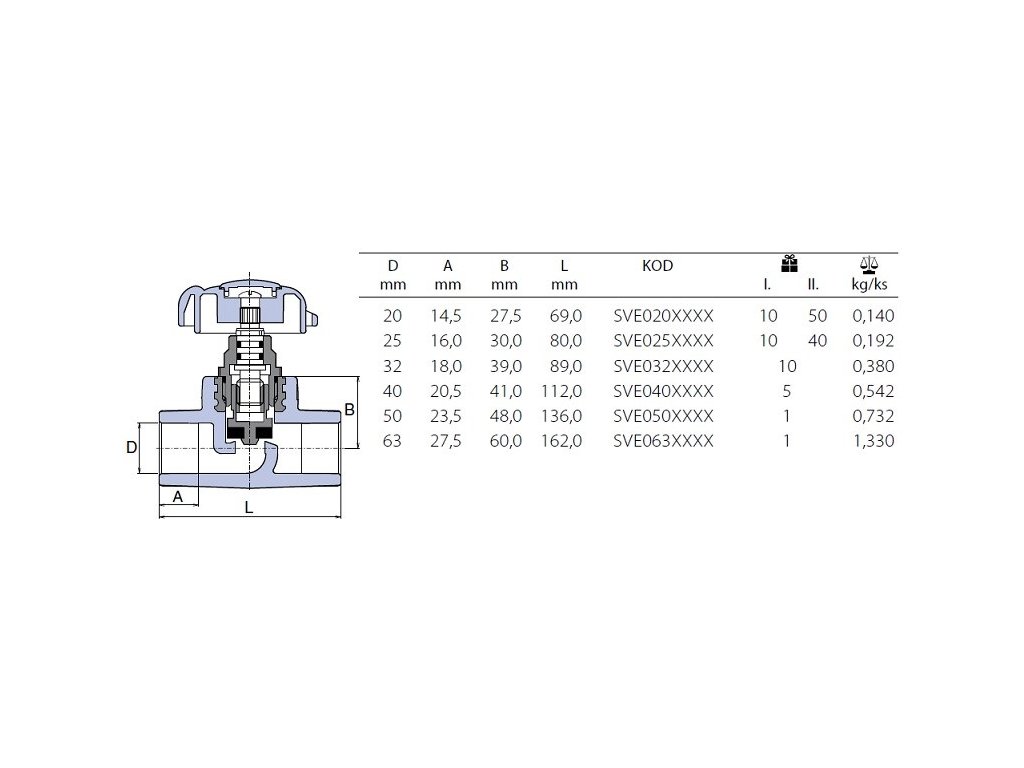 WAVIN EKOPLASTIK PPR ventil 20mm, přímý, svařovací, voda, PP-R, SVE020RCTX