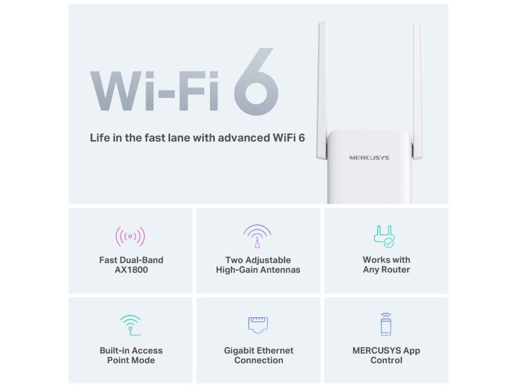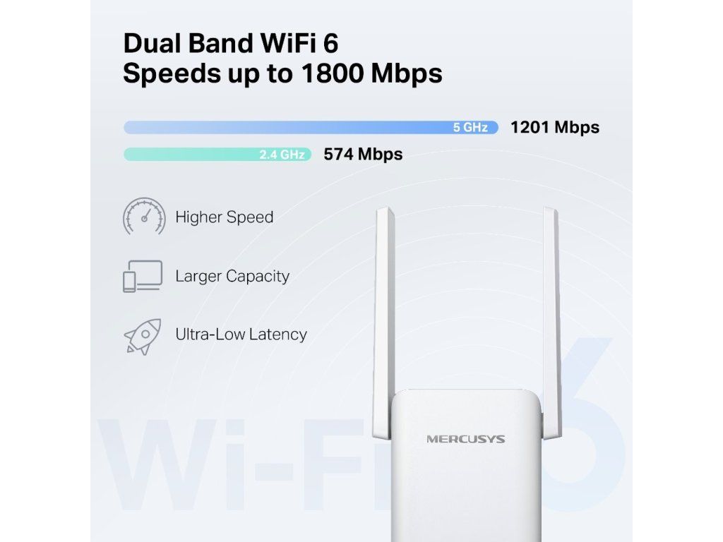 WiFi extender Mercusys ME70X vám poskytne dvoupásmové připojení s vysokou rychlostí až 1 800 Mb/s. V pásmu 5 GHz dosahuje rychlost hodnoty 1 201 Mb/s a v pásmu 2,4 GHz až 574 Mb/s. Extender je vybavený 2 nastavitelnými anténami pro stabilní připojení. Propojíte ho s jakýmkoliv routerem. Posílíte signál v celé domácnosti.