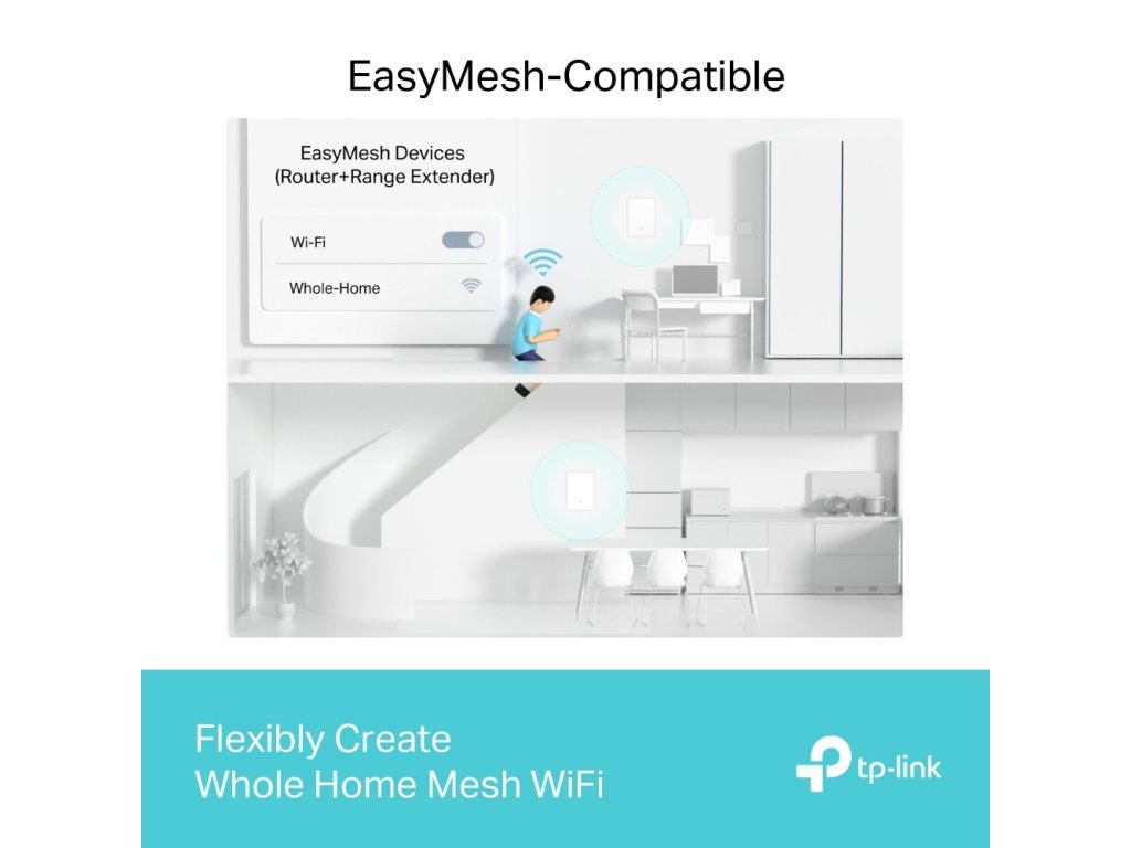 Extender TP-Link podporuje standard EasyMesh. Pokud si pořídíte další nebo extender s technologií EasyMesh, vytvoříte si multigigabitovou síť. Zbavíte se mrtvých zón Wi-Fi a zajistíte si nepřerušované streamování, i když se pohybujete po domě. Připojení je navíc pod jedním názvem, takže nedochází ke zdlouhavému přepínání mezi sítěmi. Extender sám vybírá nejrychlejší cestu připojení k routeru. Využijete tedy svou bezdrátovou síť na maximum.