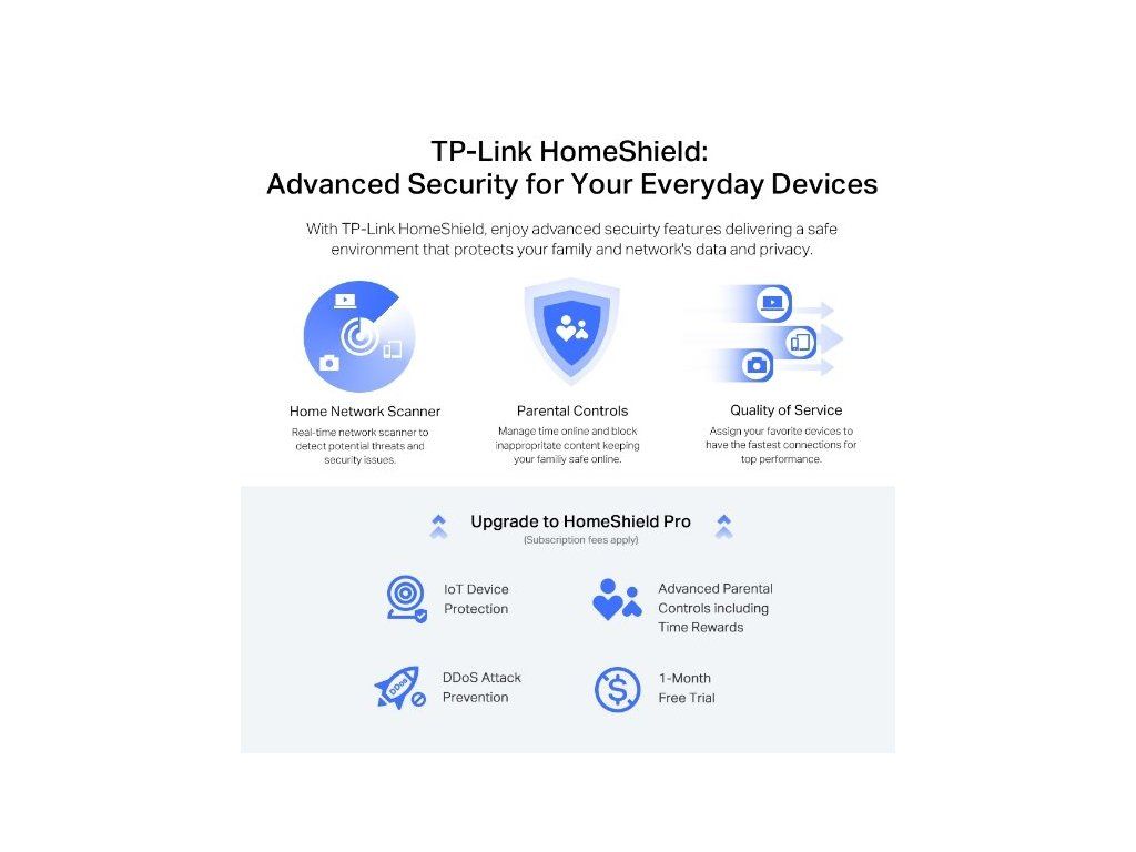 HomeShield patří mezi pokročilé služby TP-Link. Zajistí vám bezpečné prostředí a ochrání vaše data i soukromí vaší rodiny. Domácí síťový skener v reálném čase detekuje potenciální hrozby a problémy. Díky rodičovské kontrole kontrolujete čas dětí strávených na síti. Zablokujte nevhodný obsah a zabraňte svým potomkům v přístupu na nepříjemné stránky.