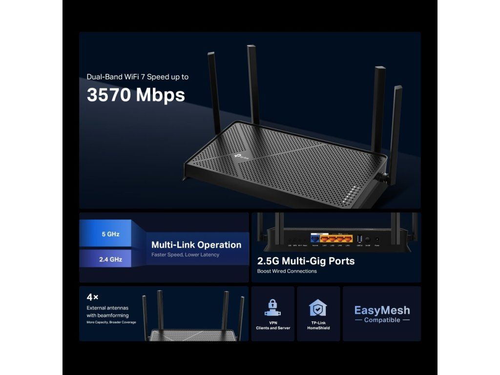 WiFi router TP-Link Archer BE230 BE3600, WiFi 7, 1x 2,5GWAN, 1x 2.5GLAN, 3x GLAN, USB, 2,4/5/6GHz, EasyMesh, 52449864