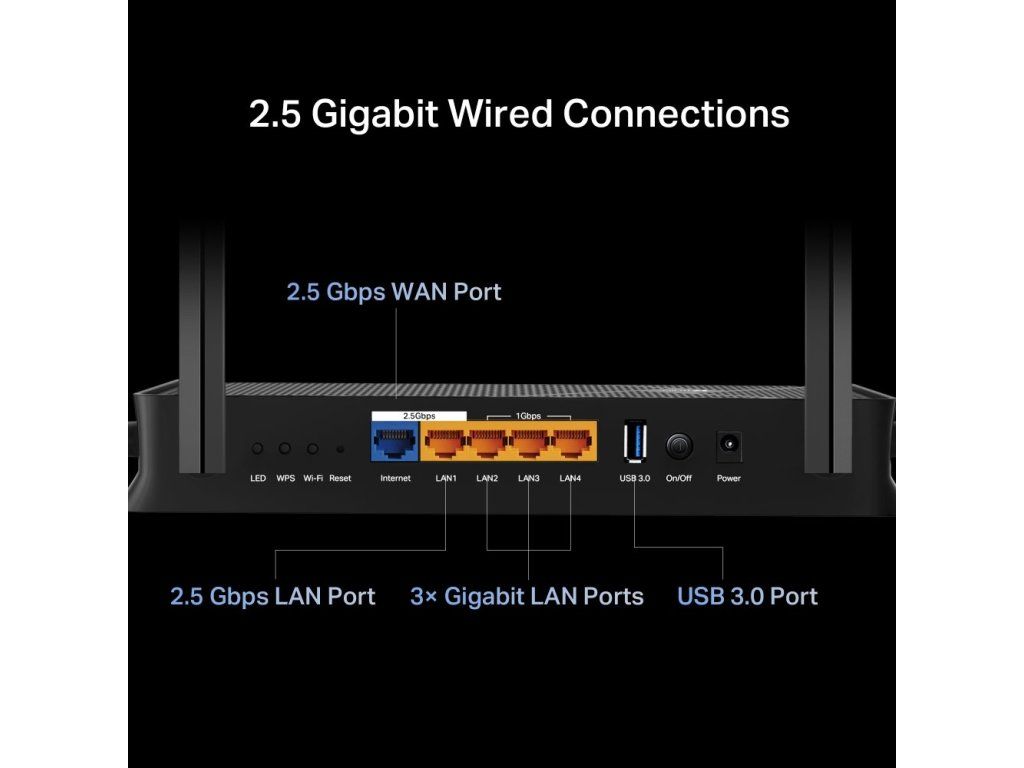 Na routeru najdete port WAN 2,5 Gb/s. Oproti typickému Gigabit Ethernet portu zvýší rychlost internetu až 2,5x. LAN port 2,5 Gb/s a jeden USB 3.0 rozšiřují konektivitu a zajišťují flexibilní využití routeru.