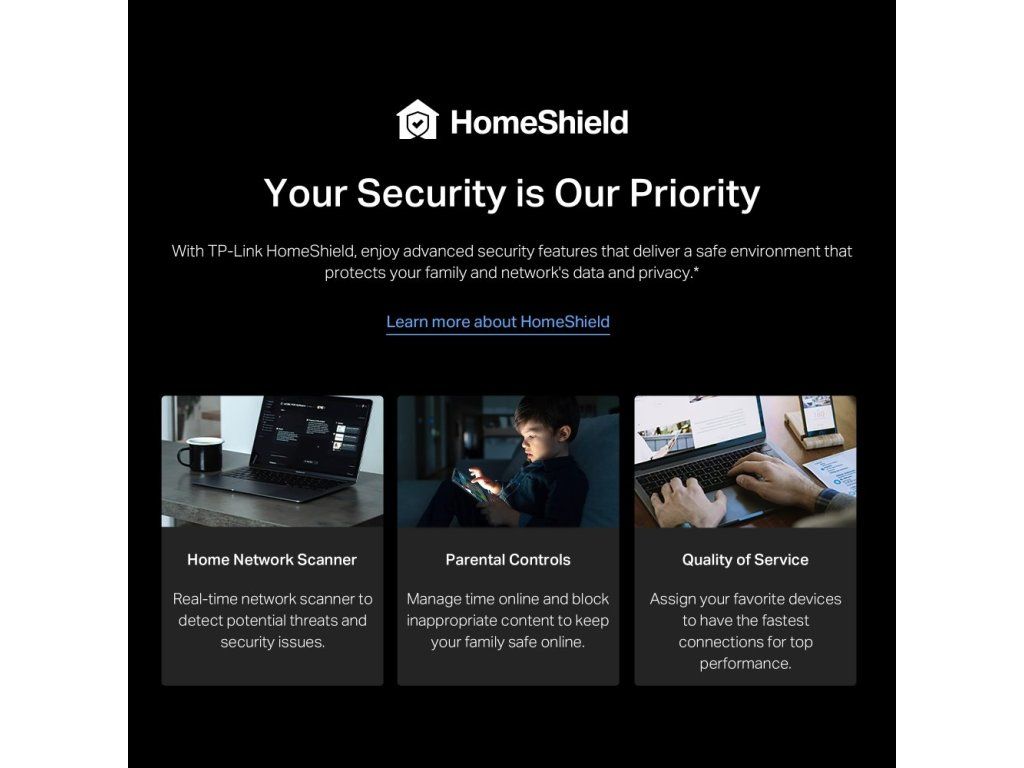 Síť zůstane v bezpečí, jelikož ji chrání špičkové funkce softwaru HomeShield. Detekuje kybernetické hrozby. Tím vám pomáhá ochránit soukromí a připojená zařízení. Zároveň vám umožní spravovat čas vašich dětí strávených online a blokovat nevhodný obsah. Ujistěte se, že vaši potomci zůstanou v bezpečí.