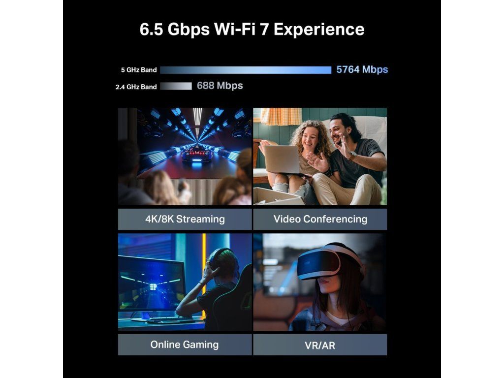 Wi-Fi router TP-Link Archer BE400 vám poskytne kvalitní dvoupásmové připojení. V pásmu 2,4 GHz dosahuje síť rychlosti až 688 Mbps a v pásmu 5 GHz je hodnota vyšší – až 5 764 Mbps. Router se tedy skvěle hodí pro náročné využití. Streamujete obsah v rozlišení až 4K/8K, používáte aplikace AR/VR, naplánujete videokonferenci, pustíte se do online hraní her a zpřístupníte si vysokorychlostní stahování souborů z internetu.