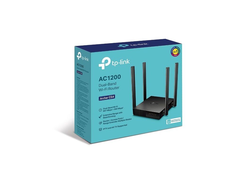 Archer C54 je základní a kompaktní AC1200 Dual-Band router značky TP-Link, který obsahuje 4x 10/100Mbps LAN, 1x 10/100Mbps WAN a 4 fixní antény. Bezdrátová část umí pracovat ve dvou pásmech zároveň a to rychlostí 300Mbps ve 2.4GHz pásmu a 867Mbps v pásmu 5GHz. Router podporuje IPv4 i nejnovější IPv6 routování. Router kromě nejvíce používaného modu AP Router podporuje i režimy Access point a Range Extender.
