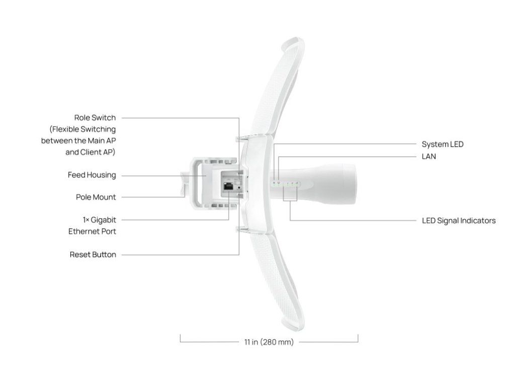 - Antény: 2×2 směrové MIMO, 23 dBi