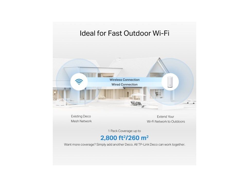 Jednotka je navržená pro venkovní nasazení na zahradě, u bazénu, v kavárně nebo jiných otevřených prostorech. Je vybavená čtyřmi výkonnými vnitřními anténami, které vytvářejí stabilní a rychlý signál i ve ztížených podmínkách. Inteligentní anténní systém eliminuje rušení ze sousedních sítí a udržuje silné připojení.