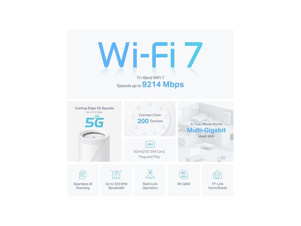 Router vám poskytne zrychlenou propustnost, vysoký výkon, nízkou latenci a silnou ochranu proti rušení. Je totiž vybavený technologií Wi-Fi 7. Využívejte všechna tři pásma Wi-Fi 7 a dosáhněte rychlosti až 9 214 Mbps. Dopřejete si špičkový výkon bez přetížení sítě. K routeru připojíte více než 200 zařízení. K dispozici máte také 3x 2,5Gb/s port pro spolehlivé kabelové připojení.
