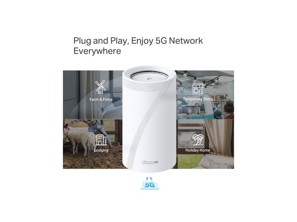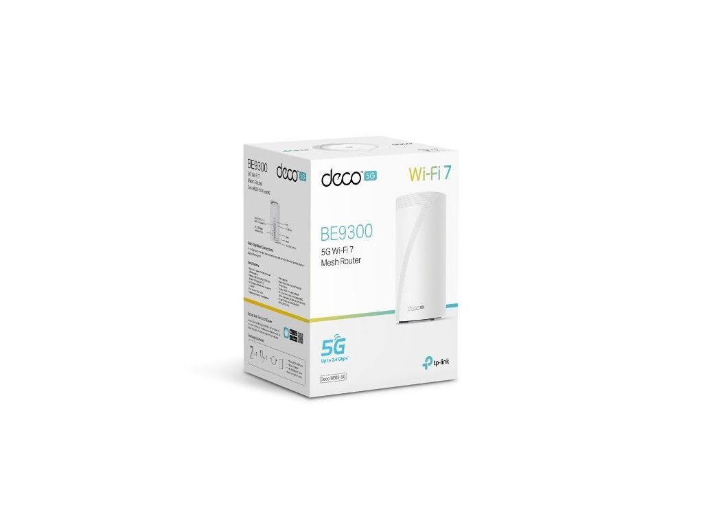 S Wi-Fi routerem TP-Link Deco BE65-5G (1-pack) si zajistíte kvalitní připojení. Nenechte se ničím rušit u sledování oblíbených pořadů na internetu nebo třeba během videokonference. Využijte 6GHz pásmo s rychlostí 5 760 Mb/s, 5GHz pásmo s rychlostí 2 880 Mb/s a 2,4GHz pásmo s rychlostí 574 Mb/s. Router vám zpřístupní 5G síť s rychlostí stahování až 3,4 Gb/s a latencí 1 ms. Těšit se můžete na snadné zapojení Plug-and-Play – stačí vložit SIM kartu.