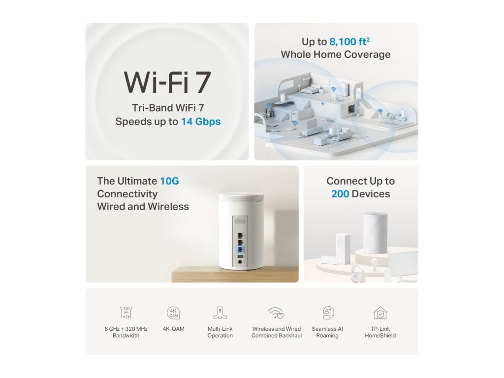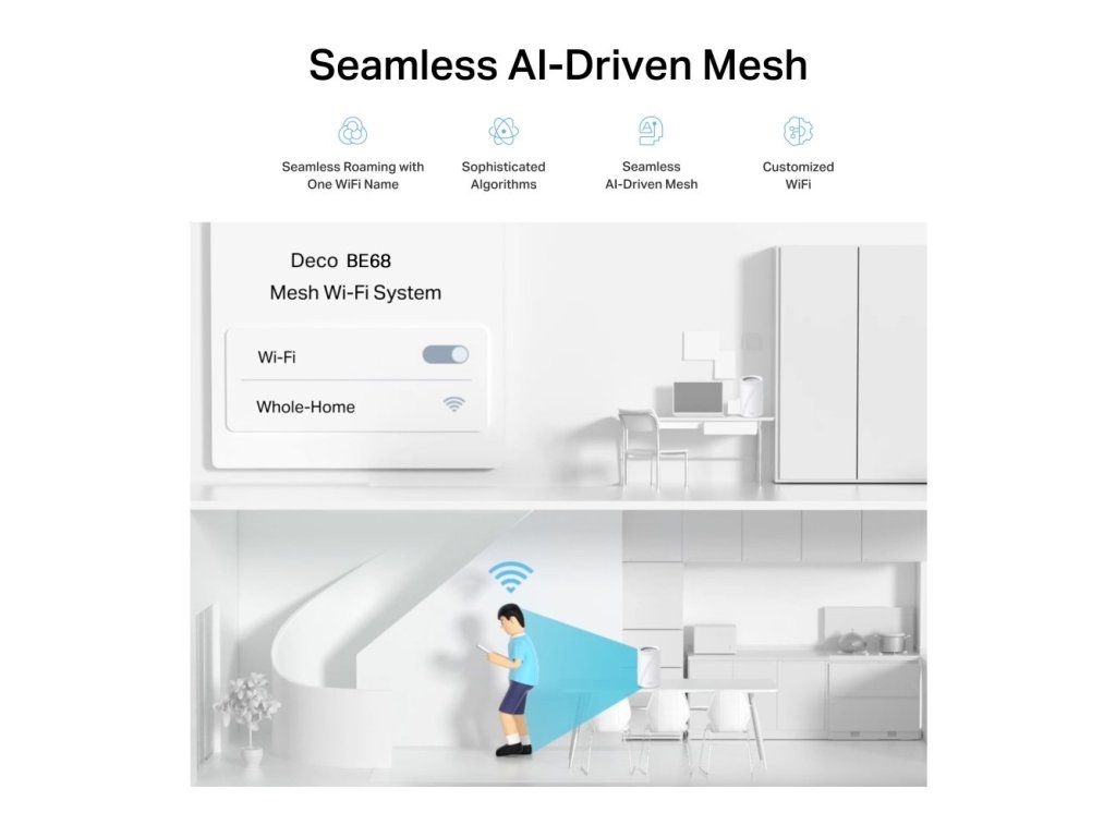 Tři jednotky vytvoří jednotnou síť s jedním názvem a pokrytím až 750 m2. Technologie AI Mesh a plynulý roaming zajistí automatické přepínání mezi jednotkami bez výpadků signálu. Systém podporuje kombinovaný bezdrátový i kabelový backhaul pro maximální stabilitu a nízkou latenci.