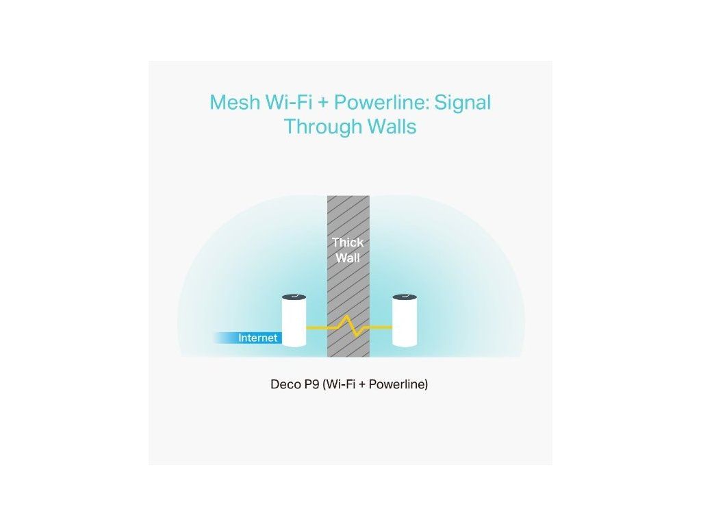 Duální Wi-Fi + Powerline jsou geniálně zkombinované v Deco P9 a vytvářejí tak silnější mesh sítě. Vyšší rychlost a bezproblémové pokrytí má na starosti technologie Powerline, která prochází překážkami skrze elektrické rozvody.