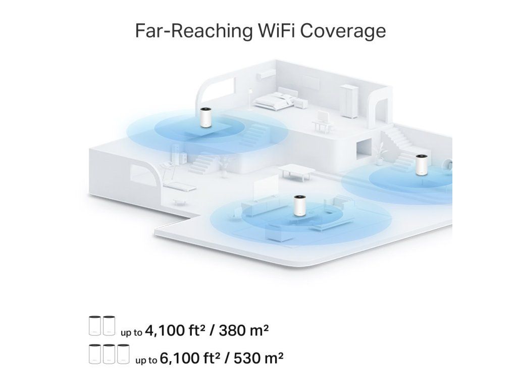 Dvoupásmová WiFi 6 s podporou MU-MIMO a OFDMA umožňuje efektivní komunikaci s více zařízeními současně. Funkce HomeShield poskytuje ochranu IoT zařízení v reálném čase, rodičovskou kontrolu, filtrování obsahu i prevenci DDoS útoků. Systém lze spravovat jednoduše pomocí aplikace Deco.
