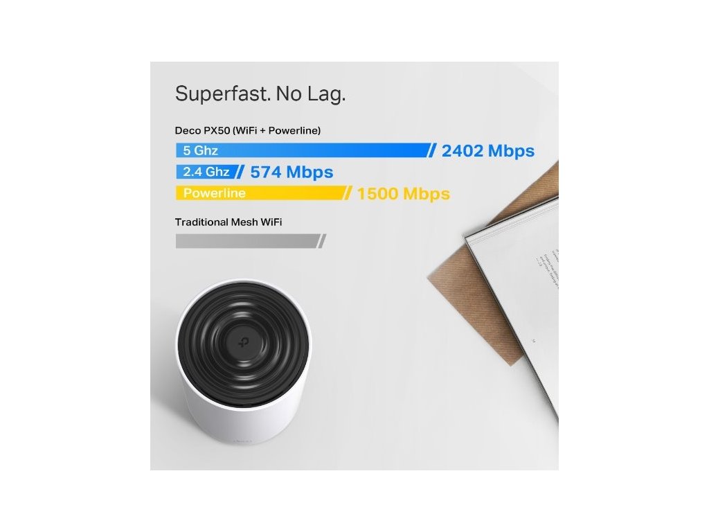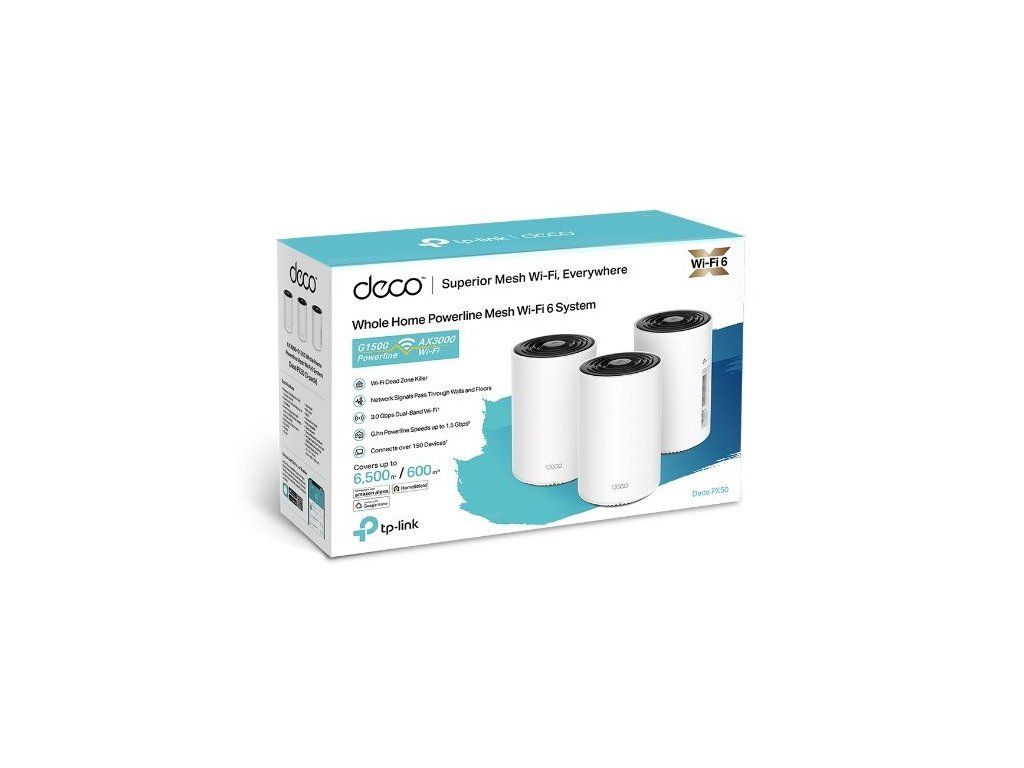 Jednotka Deco PX50 (3-pack) od značky TP-Link pokryje až 400 m². Kombinace dvoupásmové WiFi 6 a G.hn Powerline usnadňuje přenos dat mezi jednotkami Deco. Pokud bydlíte v domácnosti se silnými stěnami, vyřeší jednotky Deco váš problém s narušením signálu WiFi. Standard G.hn nové generace se postará o to, abyste měli připojení i za kovem vyztuženými stěnami.