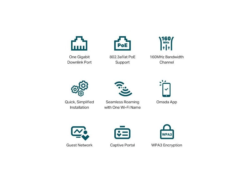 - Bezdrátové protokoly a funkce: 1024-QAM, 4x Longer OFDM Symbol, OFDMA, Multiple SSIDs (az 16 SSIDs, 8 pro každé pásmo), Enable/Disable Wireless Radio, Automatic Channel Assignment, Transmit Power Control, QoS (WMM), MU-MIMO, HE160, Seamless Roaming, Omada Mesh, Band Steering, Load Balance, Airtime Fairness, Beamforming, Rate Limit, Reboot Schedule, Wireless Schedule, Wireless Statistics
