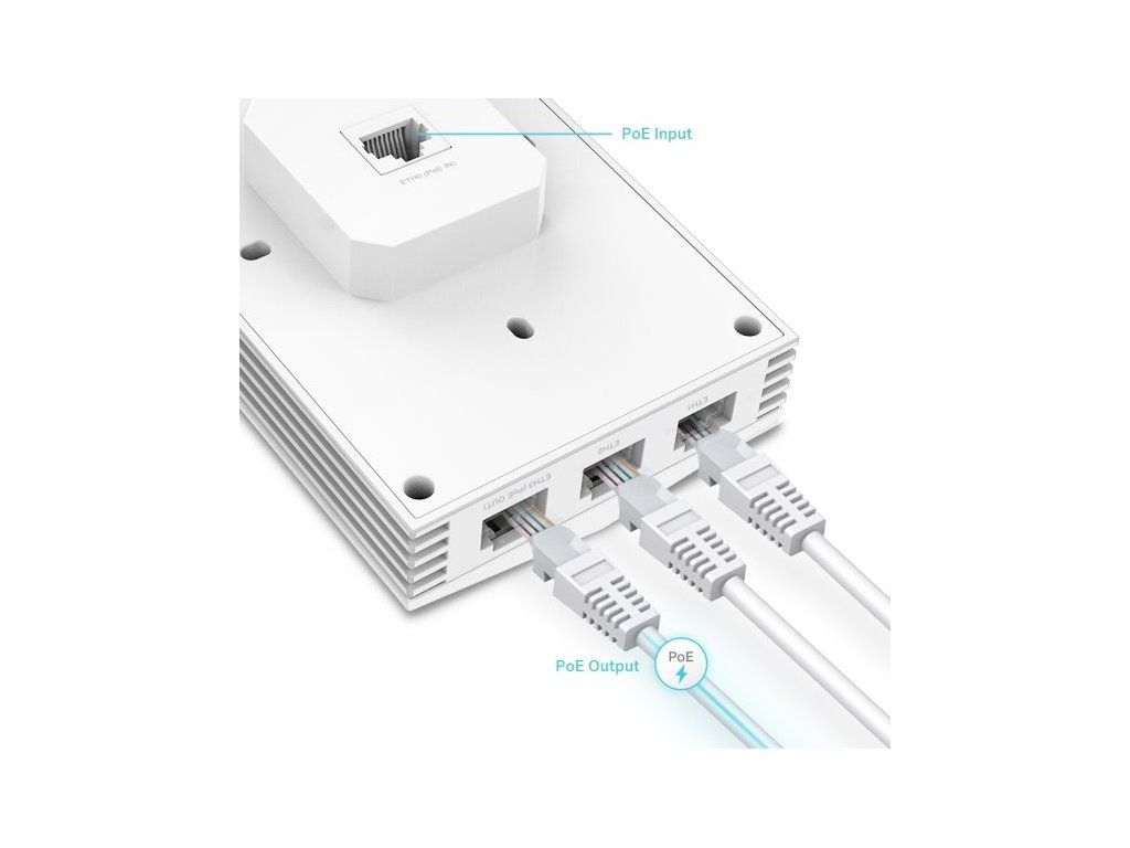 Access point TP-Link EAP655-wall podporuje PoE napájení dle specifikace 802.3af/at, k čemuž poslouží 1 ze 3 GbE RJ-45 konektorů na dolní straně zařízení. Technologie Power over Ethernet představuje vysoce praktickou funkci napájení i přenosu dat pomocí 1 síťového kabelu, proto vám hravě vyřeší obtíže při instalaci zařízení ve velice náročných prostředích, neboť ušetří námahu, náklady pro připojování dodatečných napájecích kabelů i starosti s nedostatkem elektrických zásuvek.