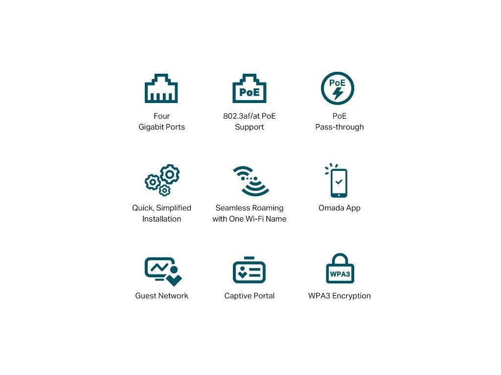 - Bezdrátové protokoly a funkce: 1024-QAM, 4x Longer OFDM Symbol, OFDMA, Multiple SSIDs (az 16 SSIDs, 8 pro každé pásmo), Enable/Disable Wireless Radio, Automatic Channel Assignment, Transmit Power Control, QoS (WMM), MU-MIMO, HE160, Seamless Roaming, Omada Mesh, Band Steering, Load Balance, Airtime Fairness, Beamforming, Rate Limit, Reboot Schedule, Wireless Schedule, Wireless Statistics
