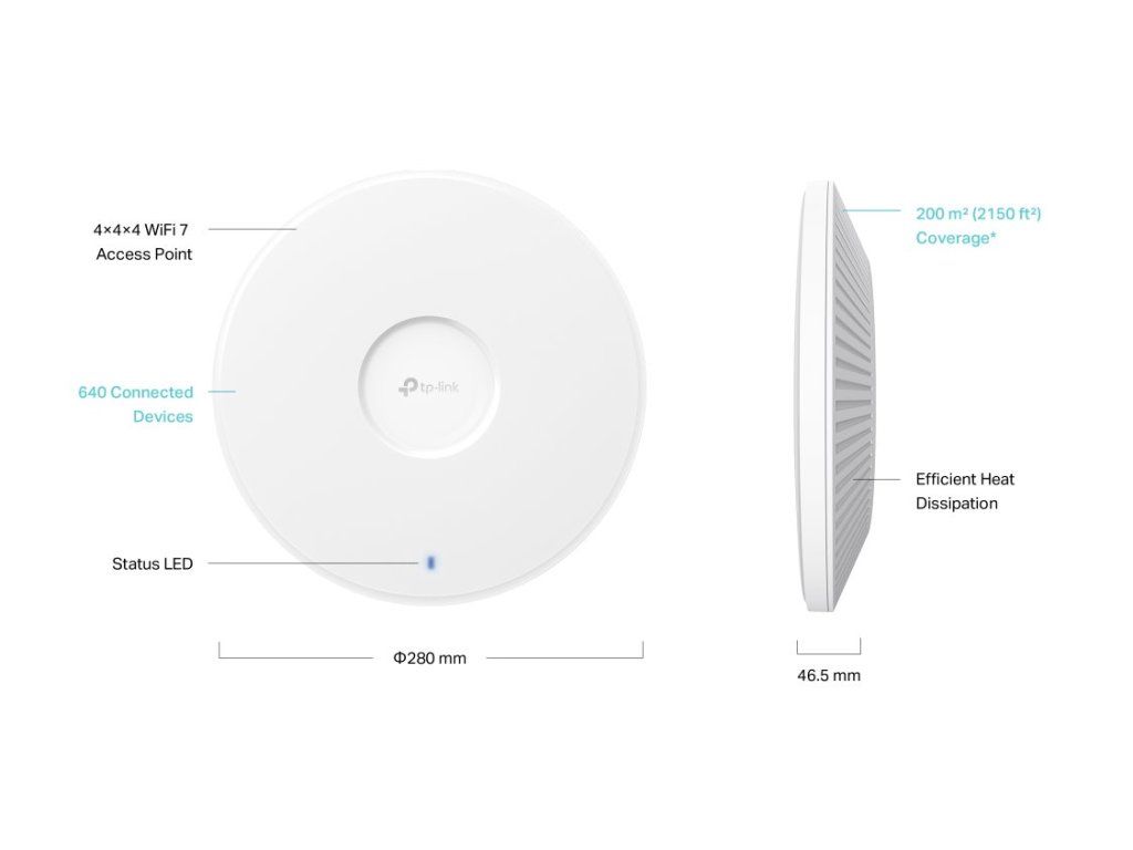 Router TP-Link EAP783 vám zajistí skvělé třípásmové připojení k WiFi. Využijete ho především v podnikání, například v hotelu. V pásmu 6 GHz síť dosahuje neuvěřitelné rychlosti až 11 520 Mbps. Při využití frekvence 5 GHz dosahuje rychlost připojení hodnoty až 5 760 Mbps a v pásmu 2,4 GHz až 1 376 Mbps. Vytvoříte tedy vysoce kvalitní síť.