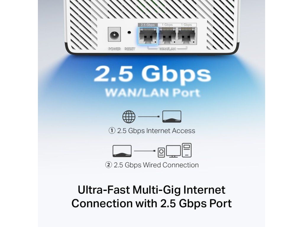 - 1× 2,5Gbps port + 2× 1Gbps LAN – multigigabitová konektivita