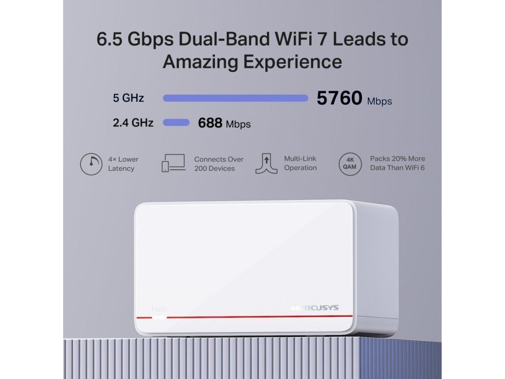 Halo systém vytvoří jednotnou Wi-Fi síť. Automaticky se se svým zařízením připojíte k nejbližší jednotce. Nedochází tedy k výpadkům signálu, i když se pohybujete po domě. Síť Wi-Fi 7 s funkcemi MLO, Multi-RUs a 4K-QAM vám zajistí stabilní připojení s nižší latencí a ochranou proti rušení.