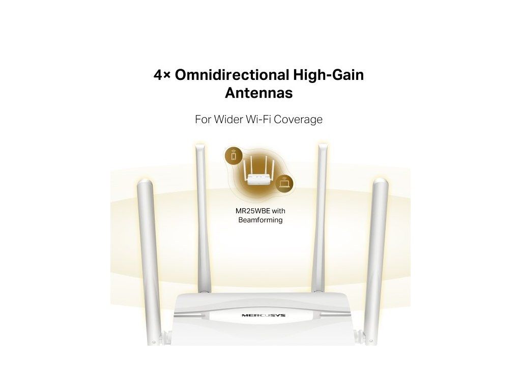 Router MR25WBE zvládne náročné streamování ve 4K/8K, hraní her ve VR/AR či videokonference. Technologie MLO umožňuje přenos dat přes více pásem najednou, čímž snižuje rušení a výpadky. Čtyři antény se zesílením signálu proniknou i přes zdi a poskytnou spolehlivé pokrytí ve více místnostech.