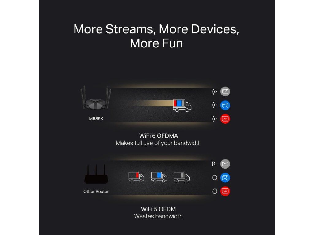 S dvoupásmovým Wi-Fi 6 routerem MR85X AX3000 od TP-Link rozšíříte pokrytí a zvýšíte rychlost a kapacitu připojení. Technologie Smart Connect automaticky vybere to nejlepší pásmo pro každé zařízení. Rychlosti Wi-Fi 6 dosahují až 3 Gbit/s, takže dokončíte stahování velkých souborů během několika minut. Zároveň streamujete obsahy v kvalitě 4K bez prodlev a přerušování. K dispozici máte 1x 2,5gigabitový WAN port a 3x gigabitový LAN port pro kvalitní a spolehlivé kabelové připojení.