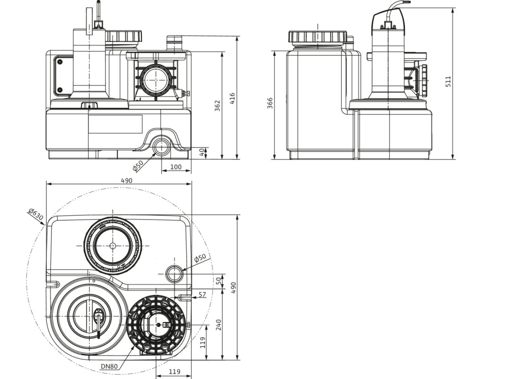 Sběrná nádrž je vzduchotěsná i vodotěsná s šikmým nátokovým sběrným prostorem. Díky průhlednému víku a čistícímu otvoru na zpětné klapce jsou údržba a čištění snadné. Vysokou spolehlivost zajišťuje nerezavějící materiál z technických plastů a nerez oceli. Velkou předností zařízení je vysoký průtok, vysoký spínací objem, termická ochrana motoru a alarm. Úroveň hladiny v nádrži se měří analogovým výstupním signálem 4...20 mA.