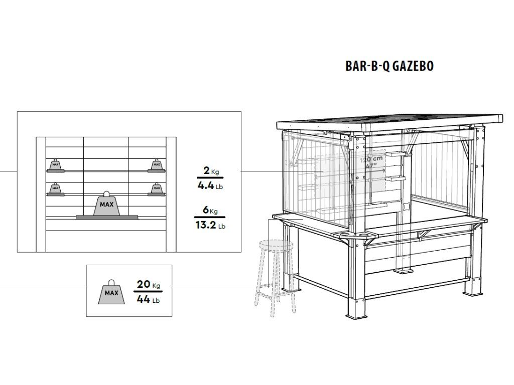 Altán Keter BAR-B-Q Gazebo využijete jako přístřešek nad grilem i jako venkovní bar pro pohodlné servírování nápojů a občerstvení. Součástí konstrukce je barový pult ve výšce 105 cm, který poskytuje dostatek prostoru pro přípravu i podávání. K dispozici máte celkem 5 polic, z toho čtyři menší s nosností 2 kg a jednu větší s nosností 6 kg. Samotný barový pult unese až 20 kg, takže na něj bez obav odložíte nádobí, nápoje i připravené jídlo. Praktické držáky na sklenice udrží vše přehledně uspořádané a konstrukce umožňuje také umístění televize pro ještě lepší atmosféru při setkání s přáteli.